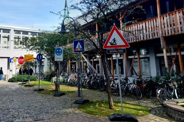 Der Oktober stand am gesamten kirchlichen Gelände an der Preysingstraße unter dem Motto der Gerechtigkeit. Als sichtbares Zeichen wanderten acht Verkehrsschilder der Gerechtigkeit des Künstlers Johannes Volkmann von einer Bildungsstätte zur nächsten. So übernahm die Romano-Guardini-Fachoberschule am 18. Oktober die Schilder von der Katholischen Stiftungshochschule. Innerhalb einer Woche widmeten wir uns in den verschiedenen Fächern dem Thema „Soziale Gerechtigkeit“. Am 25. Oktober gaben die Schüler*innen der 12 a und der 13. Klasse dann die Schilder bei einer kleinen Andacht in der Campuskirche, gestaltet von Schülerinnen des Edith-Stein-Gymnasiums, weiter. Da das Thema Gerechtigkeit nicht nur innerhalb einer Woche gesucht, gelebt und hinterfragt werden kann, wird uns dieses Thema während des gesamten Schuljahres über weiter begleiten..